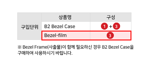 B2 Bezel Frame 전면에 사용 되는 Bezel-film으로 B2 Bezel Case를 사용하시다가 외부 환경에 의해 눌림이나, 찍힘, 스크레치, 오염 등 변형이 되었을때 별도로 구매하여 Bezel-film만 쉽게 부착하여 교체 사용 하실 수 있는 소모품입니다.