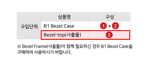 B1 Bezel Frame 전면에 사용 되는 Bezel-top으로 B1 Bezel Case을 사용하시다가 외부 환경에 의해 눌림이나, 찍힘, 스크레치, 오염 등 변형이 되었을때 별도로 구매하여 Bezel-top(사출물)만 쉽게 부착하여 교체 사용 하실 수 있는 소모품입니다.